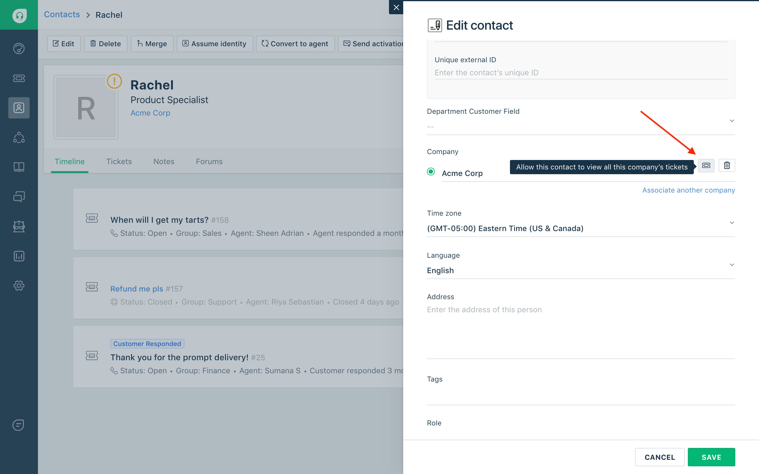 Please click on the 'Edit' option against the contact that has to have this option enabled and click on the ticket icon next to the company field. Enabling this would allow the contact to view all tickets from that company.