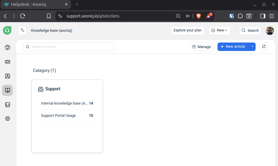 To add a new article to the Knowledge base of Axoniq, you need to navigate to the Knowledge base overview. Go to the https://support.axoniq.io/a/solutions for this. On this page, there's a "new article" button. The image below shows the new article button: